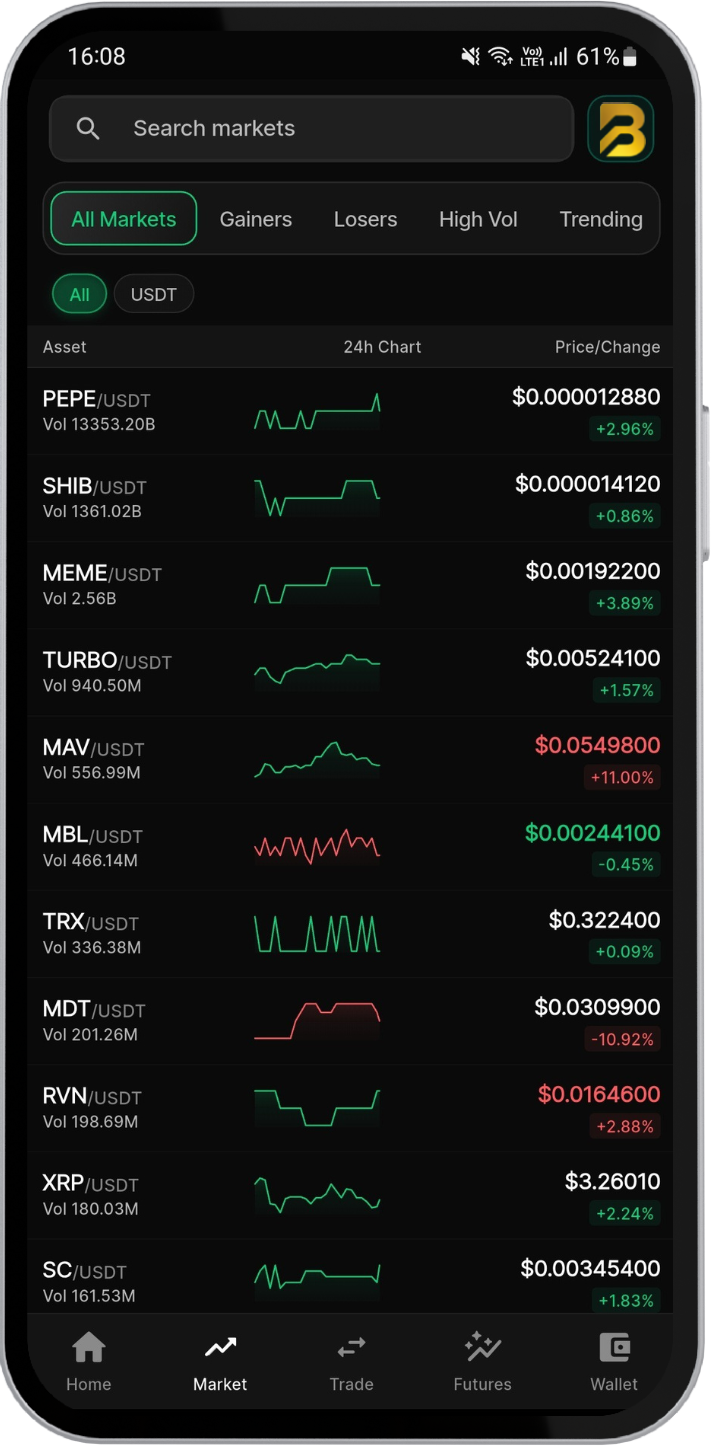 Bénéficiez d'un trading de cryptomonnaies fluide grâce à notre application mobile. Accédez à des données de marché en temps réel, à des transactions sécurisées et à des outils de trading professionnels, directement dans votre poche.